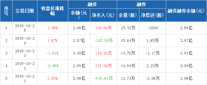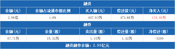 融资方面,当日融资买入607.93万元,融资偿还473.88万元,融资净买入134.06万元。融券方面,融券卖出1.1万股,融券偿还1.42万股,融券余量15.32万股,融券余额67.71万元。融资融券余额合计2.99亿元。