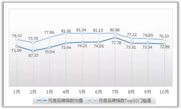10月,上榜企业商业地产品牌指数综合平均值为72.89,Top10门槛值为76.10,较上月数据波动并不明显。从统计数据来看,房企抓住国庆、万圣节等重要节点举办各类献礼祖国、与消费者互动活动,全民参与度较高,品牌溢价得到一定提升。