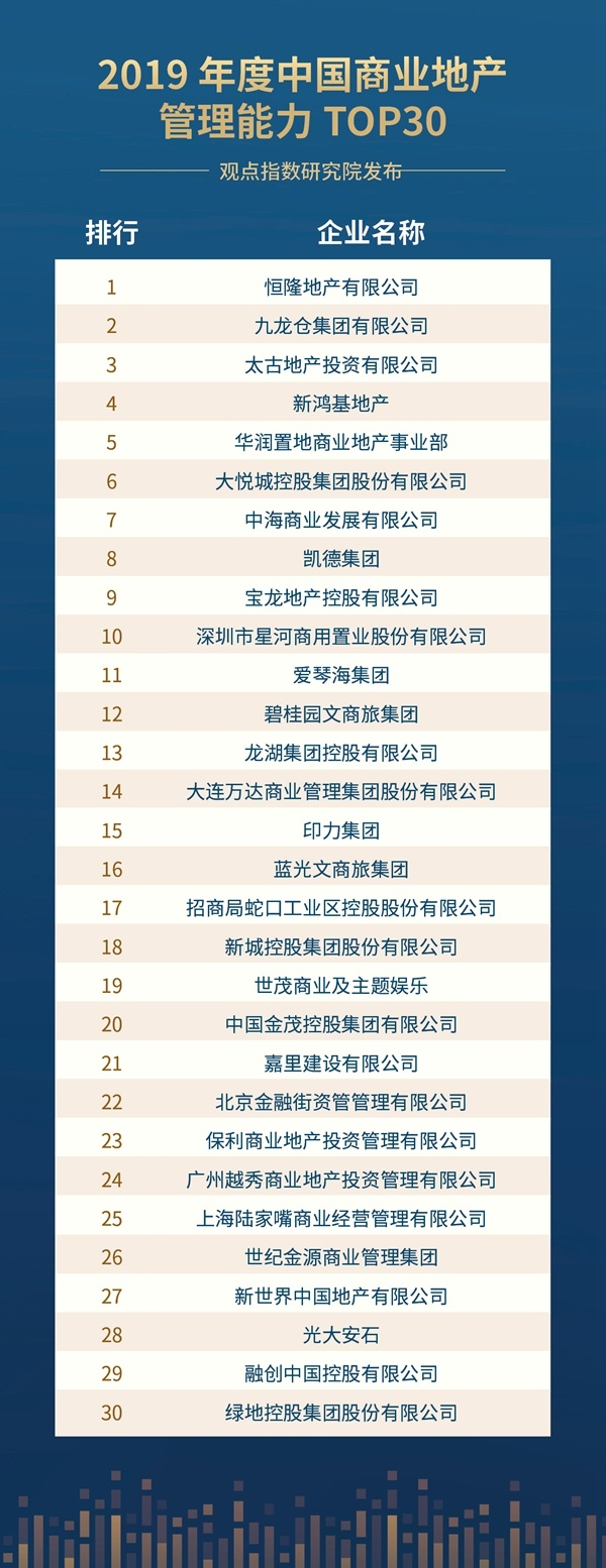 2019中国商业地产管理能力TOP30,旨在表彰过去一年全力提升管理能力,表现超群的商业地产企业。