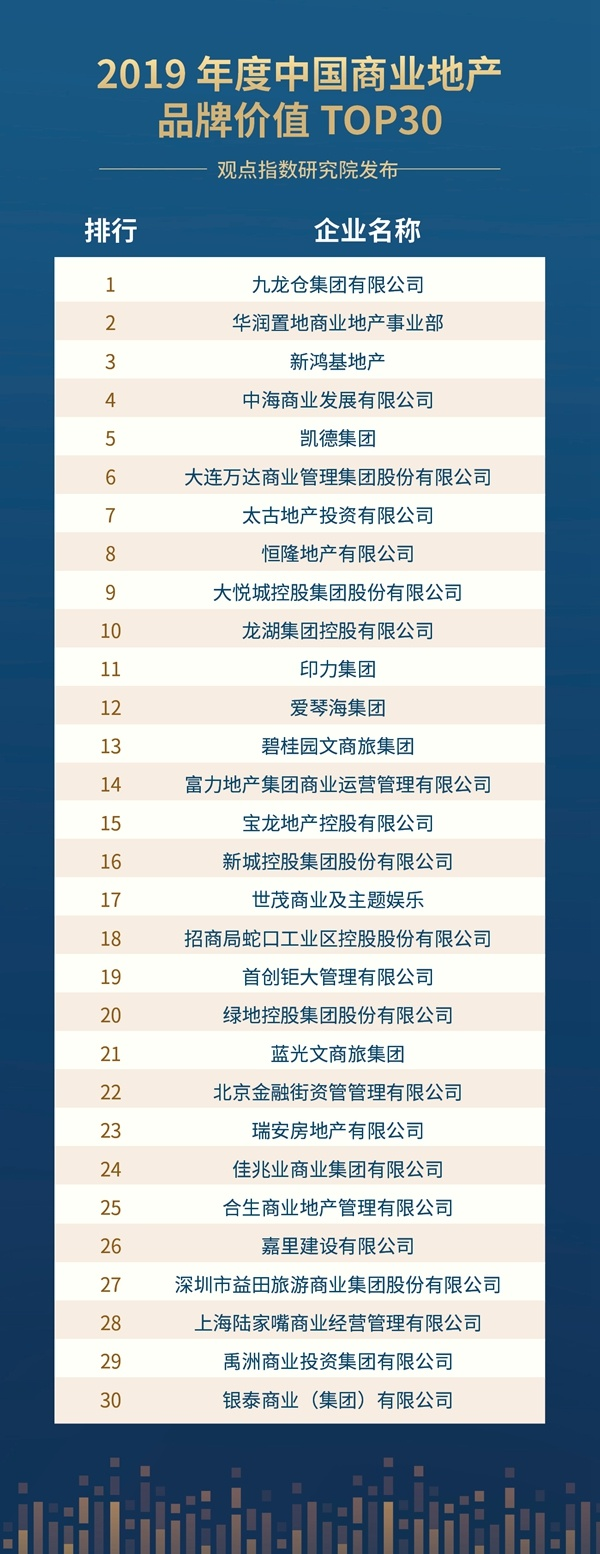 2019年度中国商业地产品牌价值TOP30,为了表彰2019年度中国商业地产领域中营造出色品牌知名度、美誉度和忠诚度的企业,观点指数研究院从品牌熟知度、租户认可度、城市推动力、社会贡献等多个维度综合评选出具备优秀品牌价值的企业。
