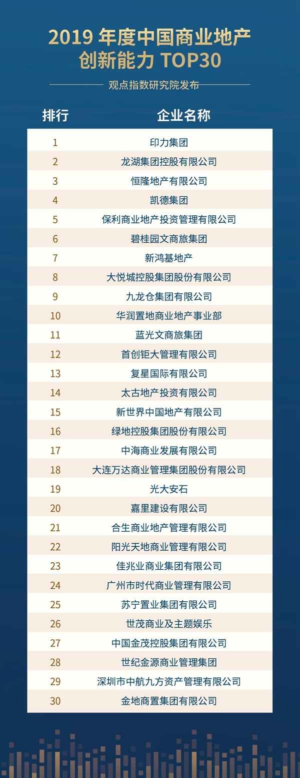 2019年度中国商业地产创新能力TOP30,旨在表彰过去一年中在商业地产领域中,不断追求创新,向行业未来探索的商业企业。