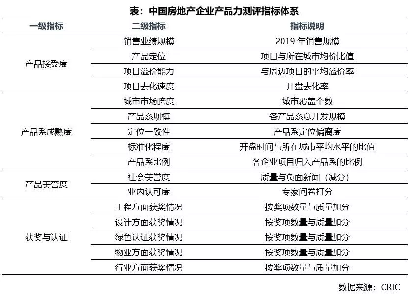 《中国房地产企业产品力TOP100》排行榜共分为四个一级指标,从“产品接受度”、“产品系成熟度”、“产品美誉度”、“获奖与认证”四个角度对企业产品力进行评价。
