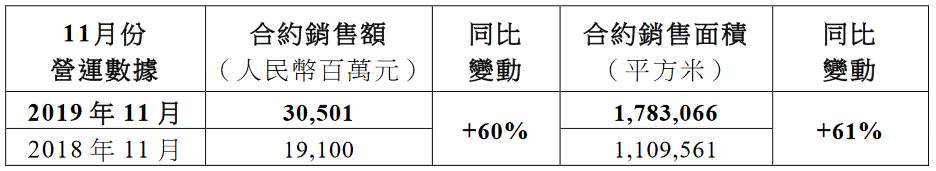 2019年11月,合约销售额约为人民币305.0亿元(2018年11月为人民币191.0亿元) ,合约销售面积为1,783,066平方米(2018年11月为1,109,561平方米),较去年同期分别上升60% 及61%。 2019年11月平均销售价格为每平方米人民币17,106元。