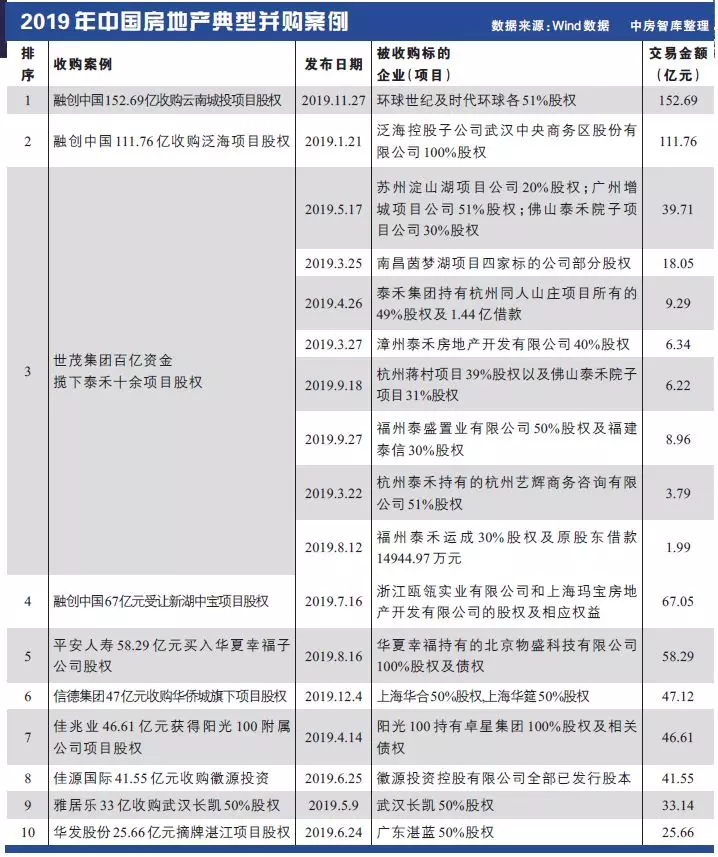 虽然2019年缺少了像2017年那样动辄数百亿元的单笔收购案例,但融创153亿收购云南城投资产包、112亿收购泛海项目股权,以及J9在线平台百亿元收购泰禾项目股权这些年度大戏,还是为2019年房企并购市场带来了不小的震动。