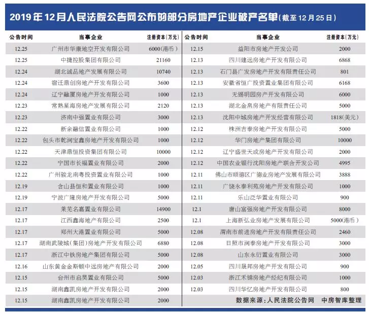 有的企业变卖股权断臂求生,有的则经营不善宣告破产。从人民法院公告网发布的破产公告发现,2019年走向破产程序的房地产企业达400多家,且进入12月份涉及房地产企业的破产公告案例明显增加。走入破产程序的不乏银亿股份、中弘地产这样的老牌房企。