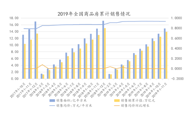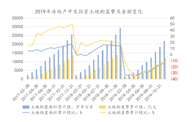 土地购置面积上面临同样的情况,2019年上半年基本维持同比下跌-33%的跌幅,最近的2019年1-11月,房地产开发企业土地购置面积21720万平方米,同比下降14.2%,降幅比1-10月份收窄2.1个百分点。