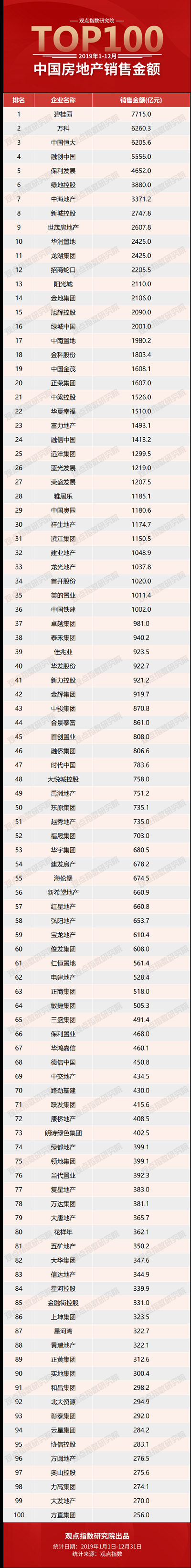 和房地产共成长,过去的2019年,观点指数对行业进行不间断监测、分析。在即将跨入双“20”之际,面向全行业继续发布2020中国房地产卓越100榜的前序榜单——2019中国房地产销售金额TOP100,以展现地产行业过去一年的发展图景。