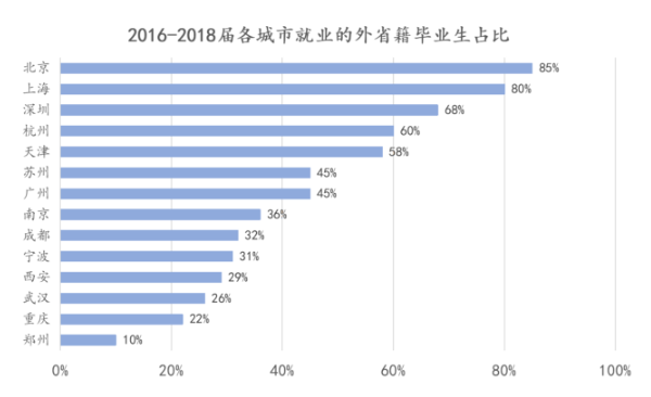 根据人民日报发布的数据显示,2016-2019届,北京、上海、深圳就业的外省籍毕业生占比排行靠前,分别为85%、80%和68%。同时,需要注意的是,一些二线城市如杭州、天津、苏州、南京、成都、宁波等均排在前列,杭州甚至以60%的占比超越广州,成为就业的外省籍毕业生占比第四的城市。