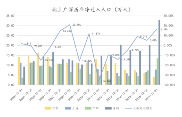 如果从北上广深近年来的净迁入人口来看,除北京外,上海、深圳和广州的净迁入人口都在不同程度增加。其中2015-2017年,上海保持9.01%、5.09%和16.19%的同比增长。深圳2017年的净迁入人口更是达到32.84万人,同比增长63.03%。