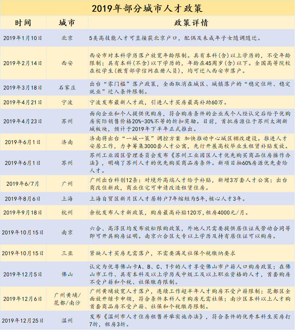 2019年8月,上海自贸区新片区发布未来的人才“居转户”(居住证转户籍)年限,将从原来的7年缩短到5年,重点产业核心人才将进一步缩短到3年。广州则于6月出台科创12条,对境外高端人才给予补贴,新增3万套人才公寓,另外12月黄埔、花都、南沙三个区,也陆续发布了人才购房放松政策。