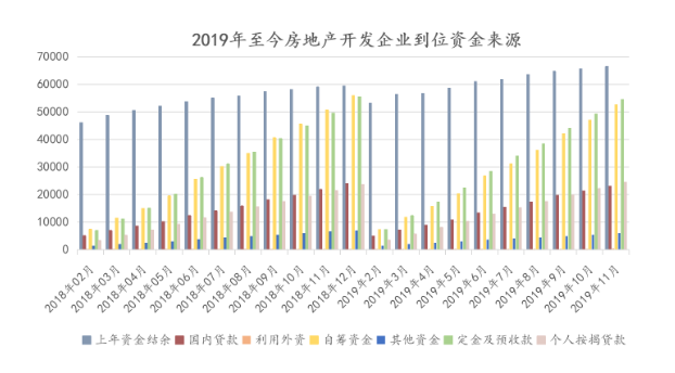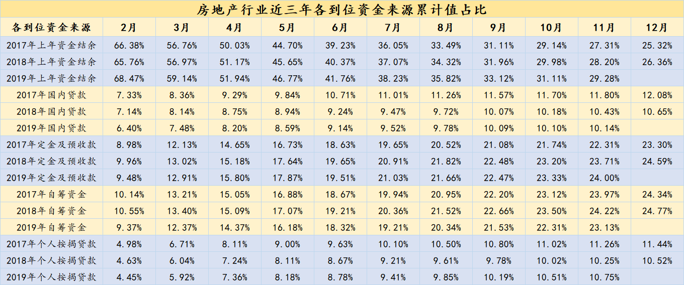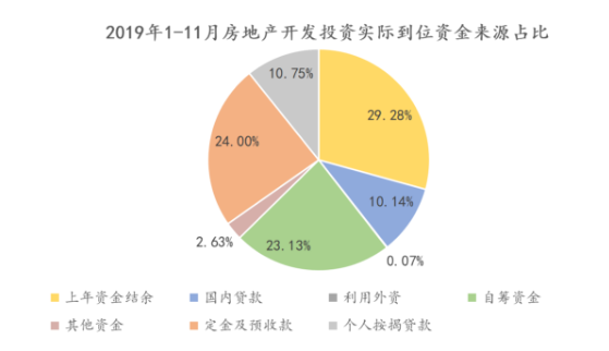 如果计算上年资金结余,2019年1-11月本年实际到位资金合计227009.28亿元。其中上年资金结余、定金及预收款和自筹资金占比最大,分别为29.28%、24%和23.13%。和2019年上半年的41.76%、19.51%和18.32%相比,定金及预收款和自筹资金占比均有大幅上涨。一定意义上,说明下半年房企在产品销售以及自我纾困上更加积极。