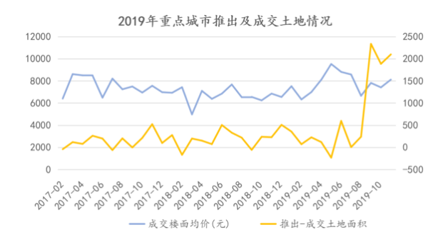 以观点指数重点监测的城市表现来看,2019年1-11月上述城市推出和成交土地面积的差额在不断扩大。从8月开始一路攀升,其中9月达到最高点,为2335.77万平方米,土地成交疲软。