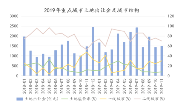 就重点城市的土地出让而言,土地出让金也较2018年出现了一定程度的下滑。其中2019年8月重点城市的土地出让金为1435.88亿元,对比上年减少了313.70亿元。土地溢价率上,2019年8-11月,平均土地溢价率均小于7.98%。另外土地出让城市结构上,2019年1-11月二线城市的比例同比上升了17.44%。