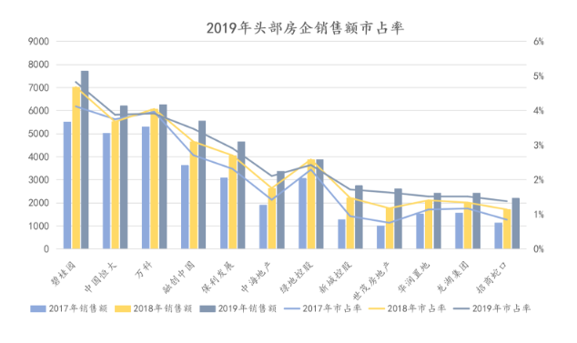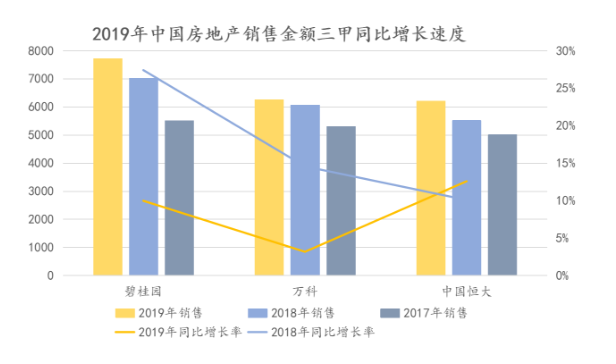 三甲合约销售超过2万亿元,如果以2019年全国商品房销售额预计为16万亿元计算,碧桂园、万科和恒大的市占率合计超过12.50%。