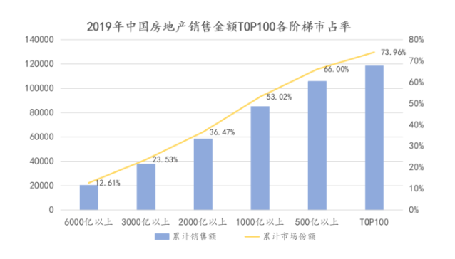 市占率方面,如上所述,观点指数以今年全国商品房销售额为16万亿元计算,2019中国房地产销售金额TOP100房企市占率合计超过74%,其中1000亿元以上房企市占率逾53%,换句话说,36家千亿房企占据行业销售的大半江山。