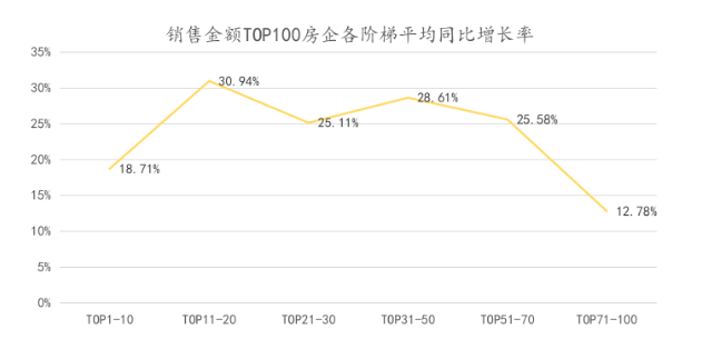 从各个阵营来看TOP11-20的平均同比增长率较为突出,达到30.94%。这些房企的销售规模在1500亿元-3000亿元之间,对市场份额的占据颇有雄心壮志,再加上回款压力带来的紧迫感,因此销售上也会更加进取。平均同比增长率最低的为TOP70-100的房企,仅为12.78%,对于目前的房地产环境而言,体量越小,越缺乏竞争和融资优势,相应的要想获得规模上的长进也会吃力一些。