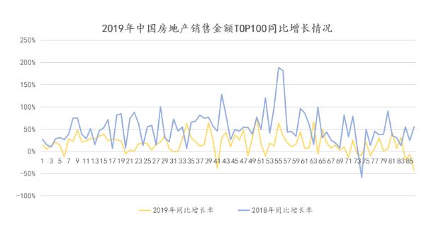 如果全面观察TOP100房企的同比增长率,可以发现上述的未达标情况早已有迹可循。过往三年均榜上有名的房企有86家,对比其销售数据可以清晰看到最近两年的同比增长率图谱。其中有69家销售增速低于去年。需要关注的是,有11家房企未能在2019年实现正增长,同比增速为负。