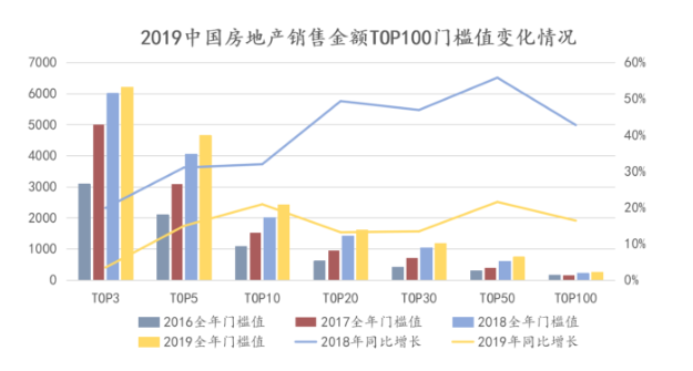 2019中国房地产销售金额TOP100的门槛值均较去年有所提升,其中增幅最大的是TOP50,较去年同期的第50名增长21.49%