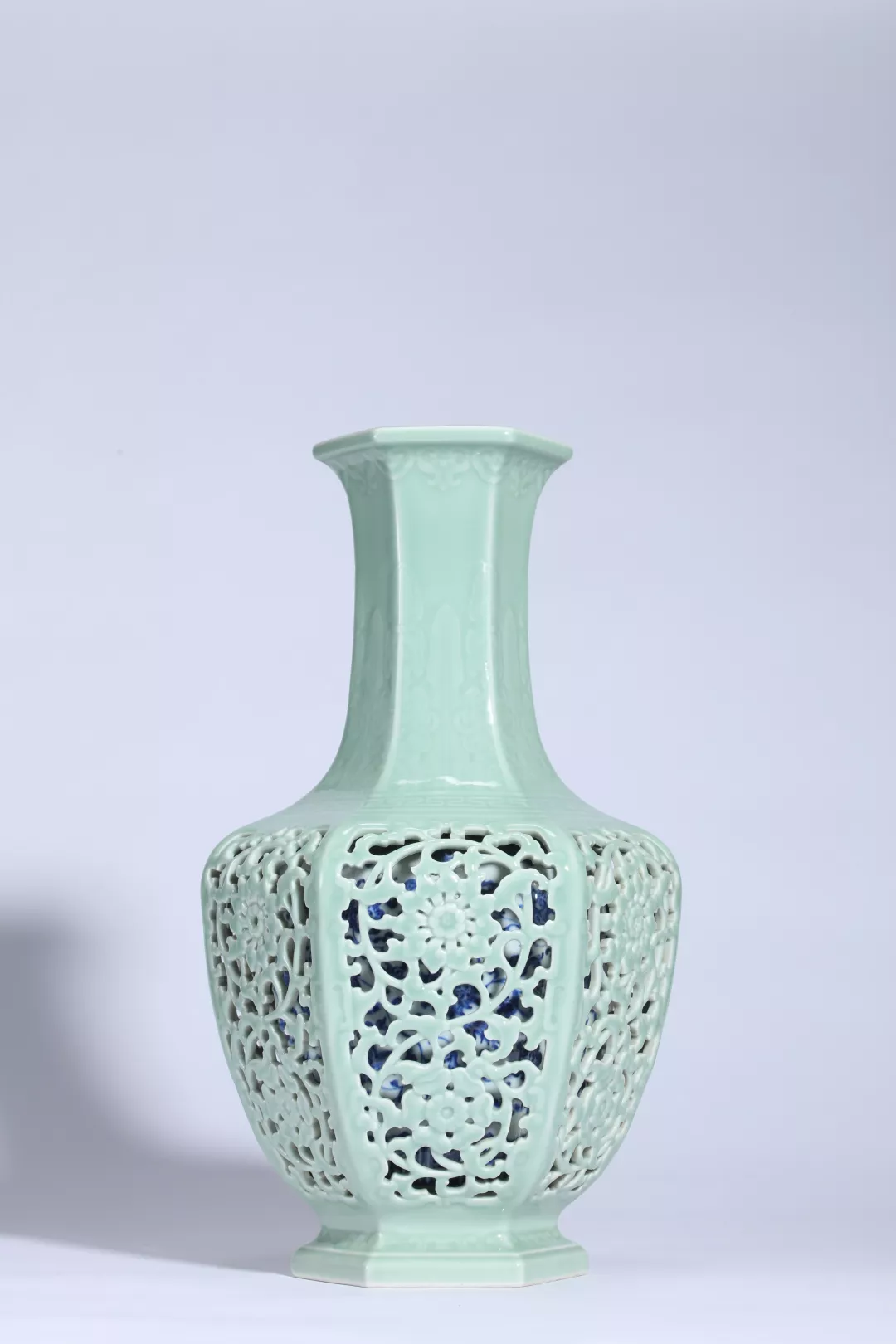 六方镂空套瓶是清代御窑的巅峰之作,其制作工艺十分复杂,纯靠手工雕镶而成,难度大,成品率极低。镂雕是清代瓷器的装饰技法之一,如本瓶穿透器壁的称之为全镂、通花。其技法是在坯体未干之时,将装饰花纹雕透,然后施釉入窑烧造。由于镂雕是通过胎体的空洞表现纹样,所以镂空部位需精心设计。瓶身外部施粉青釉,造型上将浮雕与镂空工艺相结合,透过缠枝莲镂雕,青花纹饰若隐若现,瓶中又套一青花小瓶,将单色釉和釉下彩绘合为一体,为我国古代制瓷工艺高峰时期的创新产品。