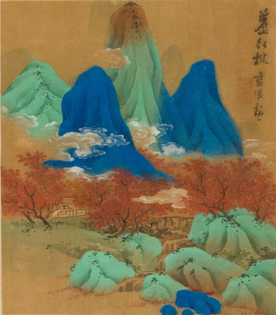 此山水双册共24开,大多作于扬州。其时蓝瑛遍法李成、米芾、黄公望等宋元诸家,已经以极其丰富的笔墨语汇自立门庭。此册中有两开米氏云山,尽显文人情致,可见米芾对其影响之深。又有数开山石皴法,皆仿南宋李唐笔意,以粗犷的墨笔勾勒山石轮廓,以侧锋横擦的小斧劈皴皴擦石面,表现山岩凝重的质感。同时,此册中设色山水以“没骨法”绘成,为蓝瑛师法董其昌兼仿张僧繇没骨法而作,亦可见董其昌对其绘画薰沐之深。