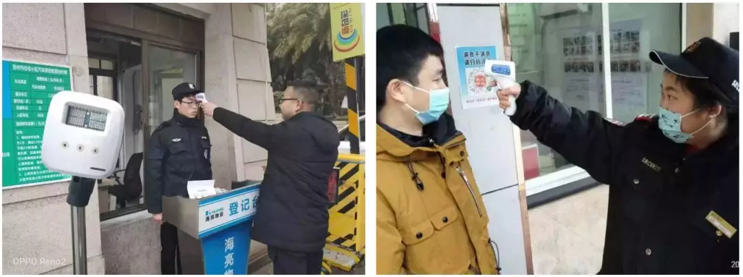 同时,在社区进出口设置体温检测,护佑业主平安回家路。