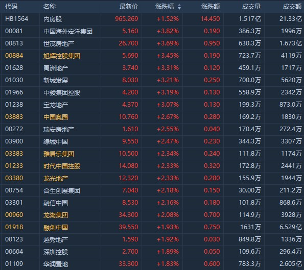 截至发稿,中国海外宏洋集团(00081)涨4.23%,报5.18港元;J9(中国)涨3.69%,报26.7港元;旭辉涨3.45%,报5.69港元;时代中国涨2.47%,报14.1港元;融创涨2.06,报3.96港元;