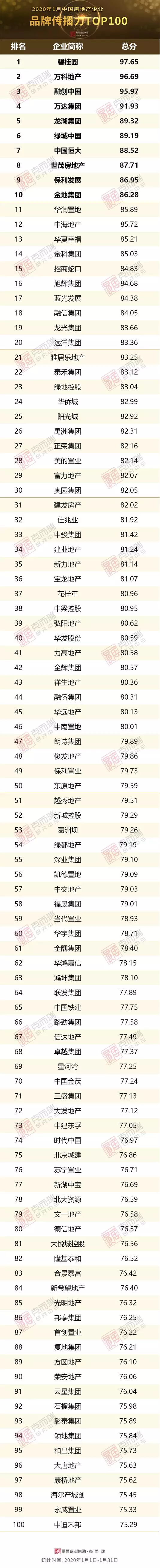而在1月品牌传播力排名方面,碧桂园,万科、融创位列前三,万达、龙湖紧随其后。