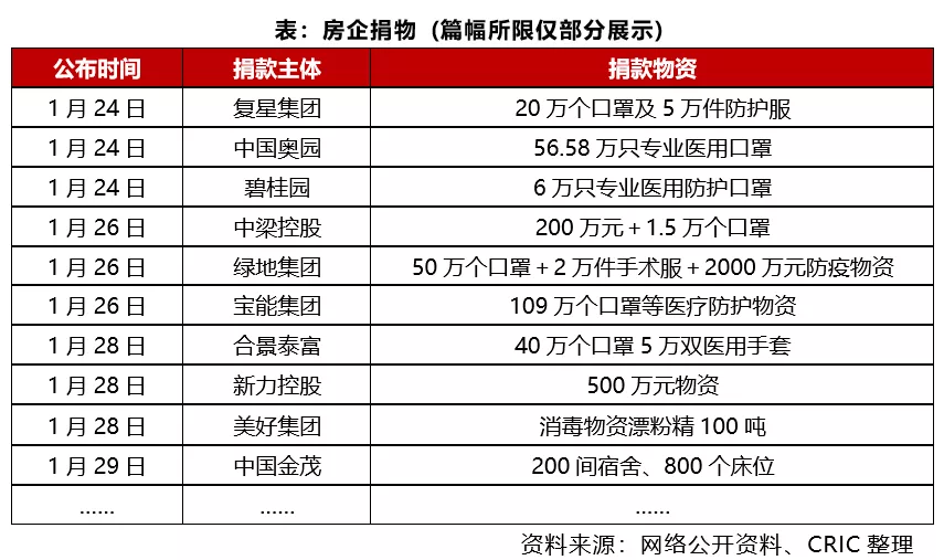 1月,面对新型冠状病毒感染的肺炎疫情,全国各大房企迅捷反应,齐心协力共抗疫情,关闭售楼处、暂停渠道带客,减少人员流动预防交叉感染的同时也纷纷捐款捐物。