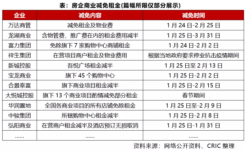 接着,万科宣布减半收取旗下在营的全部自持商业项目所有商户2月份的租金,累计超过50个项目、涉及约万家商户。1月31日,融创文旅集团宣布,免除旗下商业项目1月25日至2月29日的全部租金。