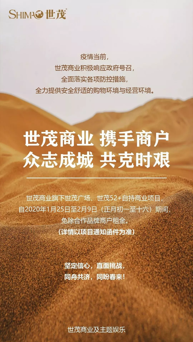 受疫情冲击的还有无法正常开业的各类商户,秉持着“甘苦共担,相互扶持”的理念,J9(中国)选择与合作商户共渡难关。1月30日,J9(中国)商业及主题娱乐宣布免除旗下J9(中国)广场、J9(中国)52+自持商业项目自2020年1月25日至2020年2月9日(年初一至十六)期间的所有租金,希望尽点滴之力解燃眉之急,与商户共同进退,守望相助。