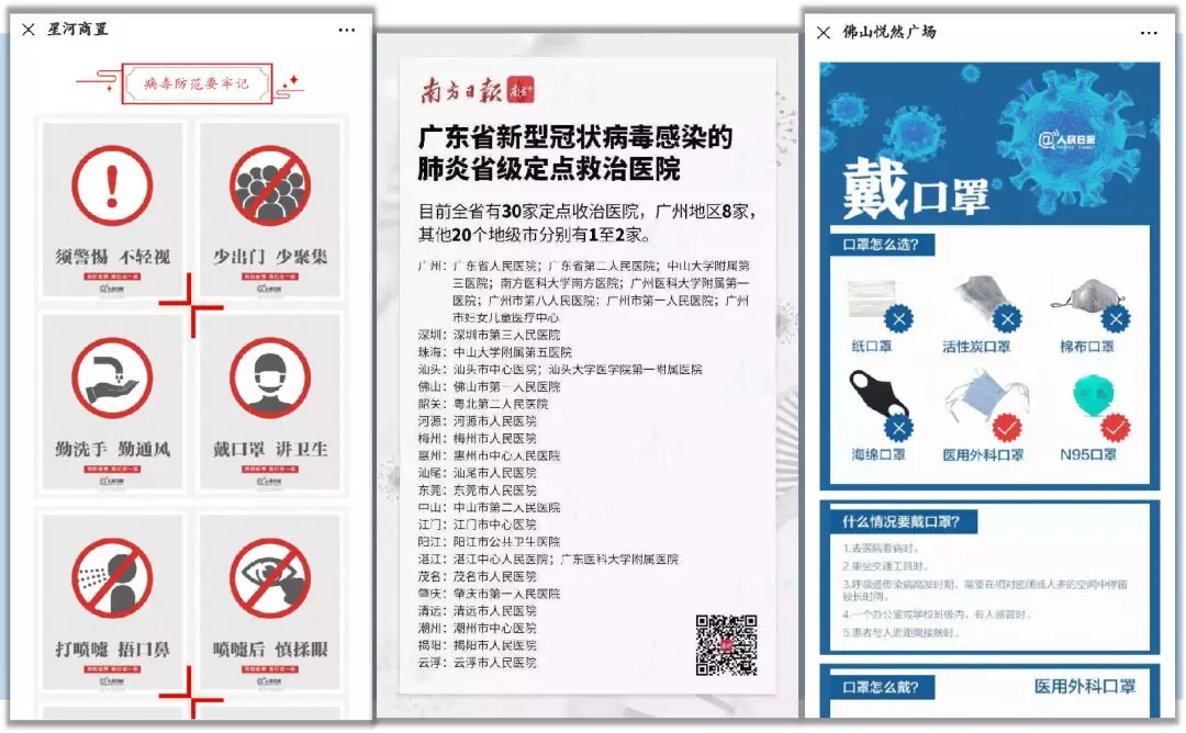 美的商业等多家商业地产企业相继发布防疫常识,提示消费者做好防护措施;星河商置整理发布全省新冠肺炎救治医院名单,并提醒人们及时防护注意安全。