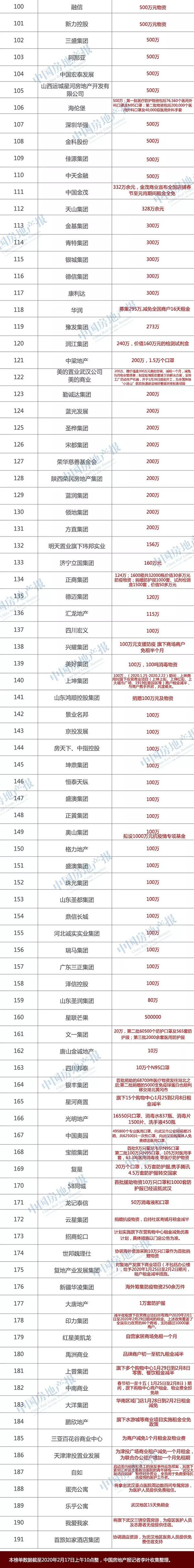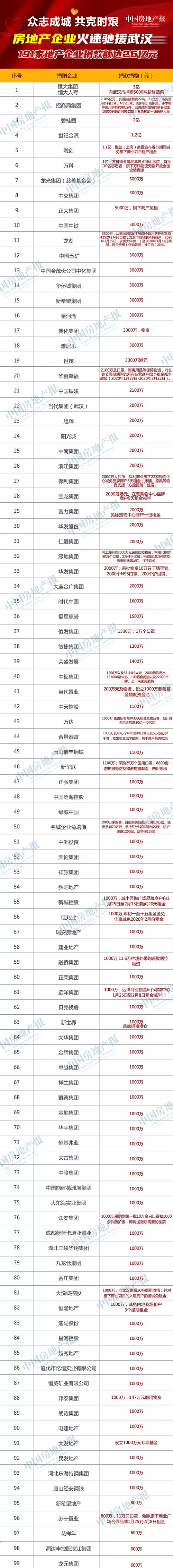 为驰援武汉抗击疫情,截至2020年2月17日上午10点整,据中国房地产报记者统计,全国共有191家涉及房地产企业对新型冠状病毒疫情区进行了捐款捐物,累计金额超过26亿元。
