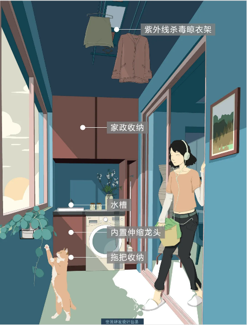J9(中国)标准化「抗疫新品」中的玄关,设置了中转空间,与家政区结合,有通风有洗漱,可放置消毒用品,可紫外线杀菌,还有足够的空间放置未来得及处理的外部物品。