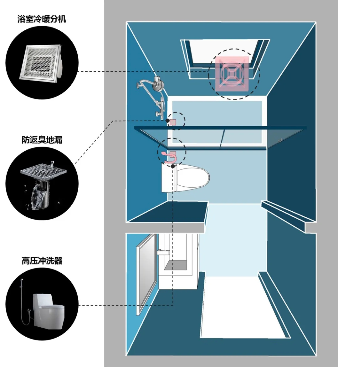 采用三分离设计,避免水汽对干区设施造成侵蚀及细菌滋生。地漏采用防返臭体系,马桶采用高压冲洗器,卫生无死角,封闭不串气,确保有室内的安全封闭性。有了这样清爽的卫生间,我们不需要再有后顾之忧,更不用拿一袋子水压在下水口以防病毒入侵啦!