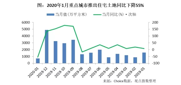 Choice数据显示,2020年1月全国20多个重点城市推出住宅土地面积约709.95万平方米,同比下降54.55%,去年同期则为1562.24万平方米。1月推出住宅土地147宗,数量比去年1月减少133宗,同比下降近50%。