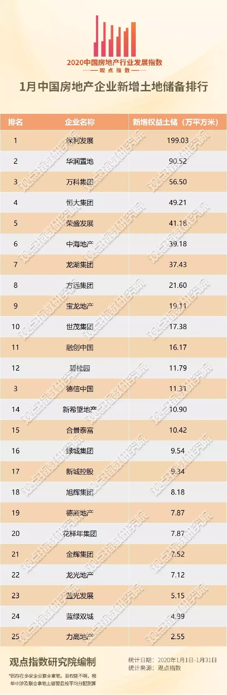 新增土储最多的也是保利发展,获得土地总建筑面积约199.03万平方米。据观点指数研究院不完全统计,1月保利发展分别在郑州、天津、济南获得土地,数量分别为2宗、1宗、1宗,建筑面积分别为6.6万平方米、4.6万平方米、17万平方米和22.5平方米。