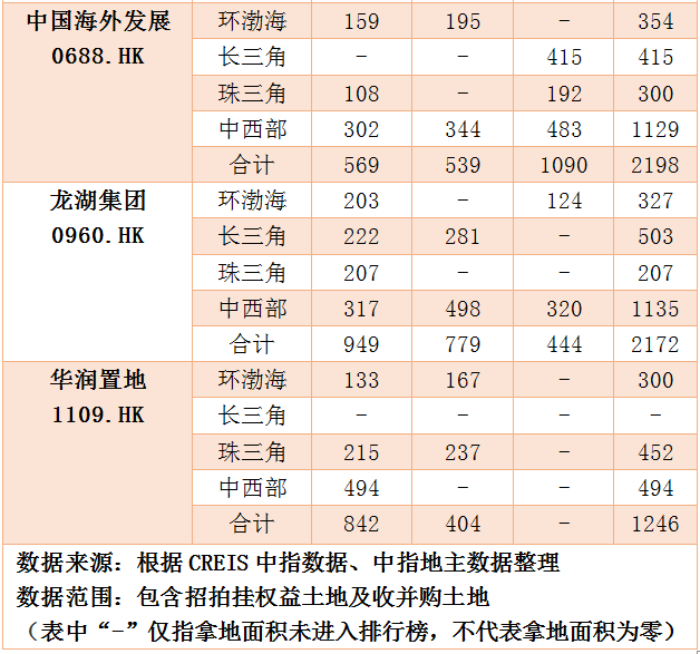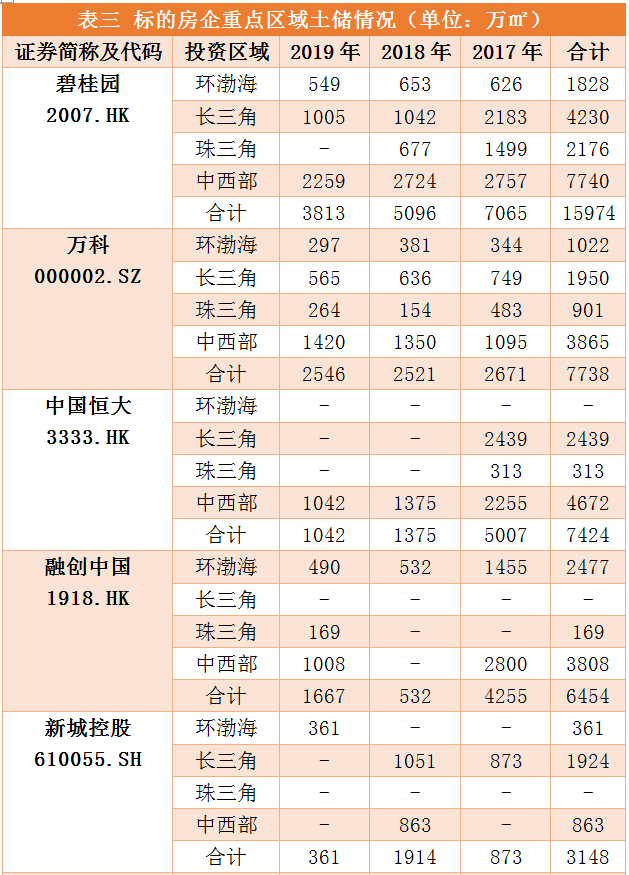 而从标的房企在长三角、珠三角、环渤海、中西部等重点区域的土储布局(见表三)来看,除了“碧万恒融”重仓上述核心城市群之外,新城控股、中海地产、华润置地、龙湖集团在上述重点区域的土储规模也较大。优质的土储布局,为上述房企日后的销售业绩奠定了丰厚的基础。