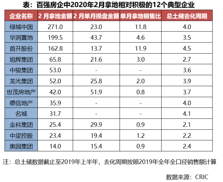 第一类是绿城、华润、首开等国企、央企及区域扩张型企业。2月拿地总价超过100亿元,且远大于其1-2月销售金额。