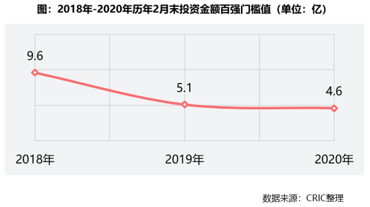 第二,截止2月末,拿地金额TOP100企业门槛值仅有4.6亿元,对比2018年和2019年同期分别下降10%和52%。