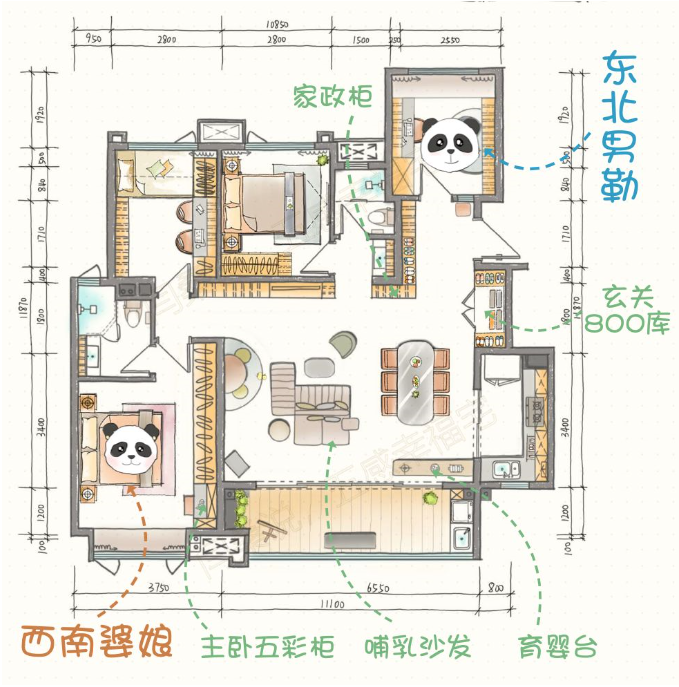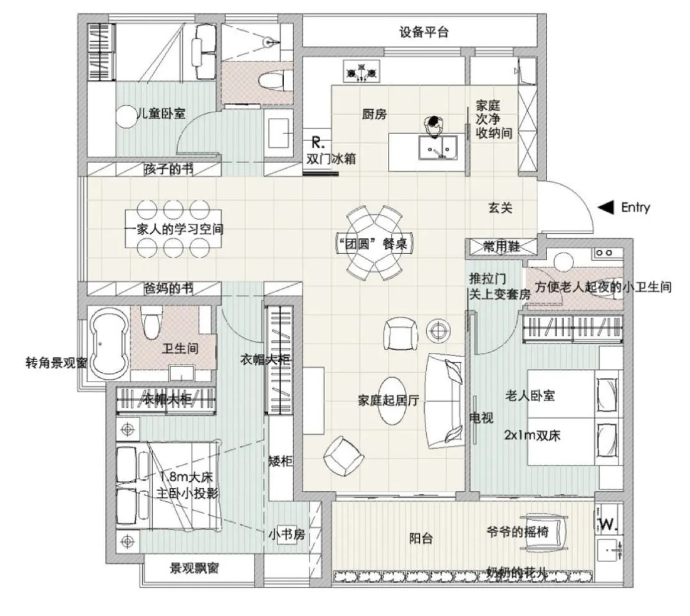 ⑤景观阳台区:父母可以坐在这里晒太阳喝茶,和环境亲密接触;如果有朋友来访,这里就是能充分享受自然的会客厅,让久在室内的人心旷神怡……