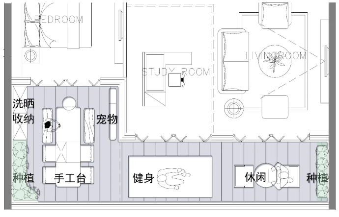 户内空间加上户外空间,就能为业主提供足够多的活动空间。这个时候,即便一家人宅在同一套房子里,但由于每个人都能找到自己的场所,家人就不会感觉拥挤憋屈。