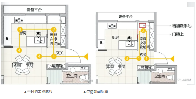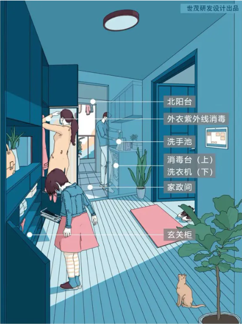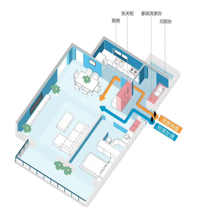 J9(中国)在入户流线分为“轻度处理”流线和“深度消毒”流线。如果只是短暂出门,简单消毒、换鞋换衣后,就可以沿着“轻度处理”动线步入客厅,如果是长时间在公共空间活动,则沿着另一条动线,流水洗手,外衣直接拿到北阳台上晾晒或清洗,不必带着脏衣上的细菌穿越客厅。