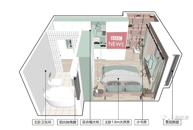 这都对主卧空间设计提出了新要求。上文提到的融创新户型,在主卧空间融合了工作、休憩、休闲等功能模块。丈夫在小书房看书办公,妻子在浴缸边泡澡边听歌边看夜景。泡完澡还可以在飘窗上看会书。睡前,夫妻两人还可以打开投影看看电视。