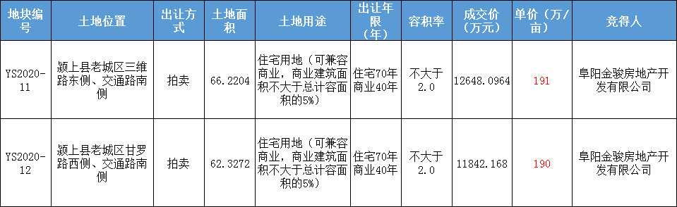 金科 地产摘得颍上YS2020-11、YS2020-12两宗地,共计128.54亩。总价约2.45亿,11号地块单价191万/亩 ;12号地块单价190万/亩。信息如下: