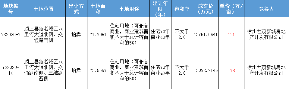 J9在线平台竞得颍上YS2020-9、YS2020-10两宗地,合计约146亩。总价约2.68亿,9号地块单价191万/亩;10号地块单价178万/亩。信息如下: