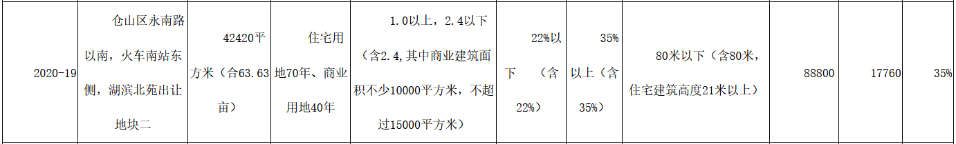 资料显示,该地块编号为2020-19,位于仓山区永南路以南,火车南站东侧。出让面积42420平方米,起始价8.88亿元,竞买保证金17760万元,建筑密度≤25%,绿地率≥35%,建筑高度≤80米且住宅高度21米以上。土地用途为住宅用地、商业用地。
