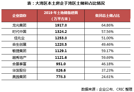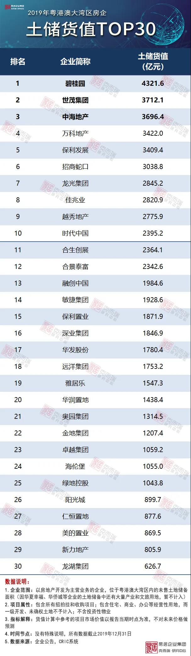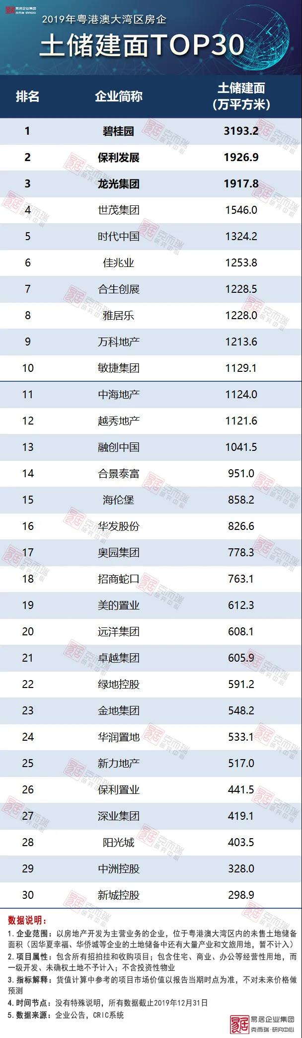 2019年底,TOP30企业于粤港澳大湾区的土地储备货值和建面总量分别达6.1万亿元和2.9亿平方米,分别同比增长7%及下降10%;其中TOP10房企土储货值和建面总量分别达3.2万亿元和1.6亿平方米,占比超过50%。而根据统计局数据显示,大湾区9座内地城市2018年商品房销售额和面积分别为1.52万亿元和0.94亿平方米,按此来看,TOP30企业的货值可以支撑大湾区未来约4年的销售。