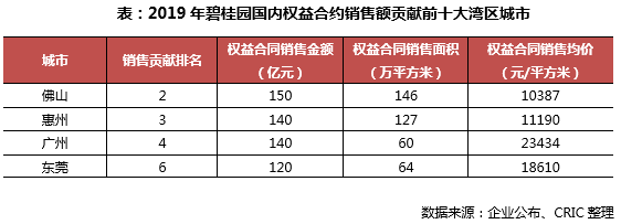 在众多房企中,碧桂园无疑成为了最大受益者,其在粤港澳大湾区的土地储备超过3000万方,远远超过其他企业;拥有大湾区的土储货值4321.6亿元,占到了30家房企总量的7%。由于在大湾区拥有充足且优质的土地储备,碧桂园近年来于该地区的销售成绩也十分可观。2019年碧桂园国内权益合约销售前十城市中,就包括粤港澳城市佛山、惠州、广州及东莞,其中佛山更是位居各城市销售魁首,2019年权益合约销售达150亿元,占到了总权益销售占比的3%,市场占有率排名第一。
