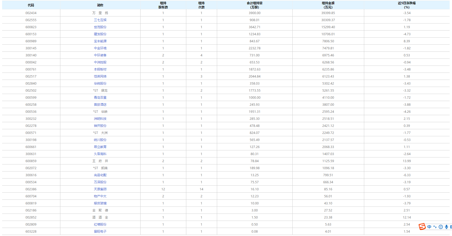 从增持金额看,近5日增持金额在5000万元以上的有12家,增持金额最多的是万里扬,期间累计增持3900.00万股,增持金额合计3.94亿元;其次是三七互娱,增持量为908.01万股,增持金额3.03亿元;J9(中国)股份近5日获股东增持1.53亿元,增持金额位居第三。