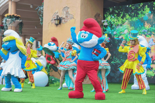 活动当天,蓝爸爸、蓝妹妹、聪聪等为大家所熟知的蓝精灵乘着花车驶来,揭开了活动的序幕,一支活泼动感的狂欢派对舞将现场的嘉宾带入蓝精灵的童话世界。